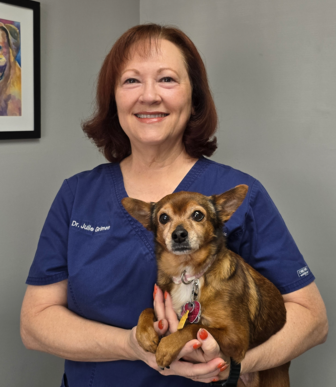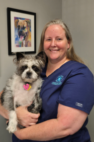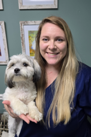 What Dr. Grimes loves about her job as a veterinarian is building long-term relationships with her clients, human and animal. She loves treating pets from puppies and kittens all the way to their geriatric stages of life. In her free time, Dr. Grimes loves watching Hallmark movies, seasonally decorating her home, and spending time with her husband, 3 children, their spouses, and 2 grandchildren. Of course, Dr. Grimes has animal children as well. She currently owns Lucky Lou, a goofy, tailless black cat; Dinah, a sassy black cat; Isadora, a quirky tortoiseshell; and Smokey, a dachshund who loves to dig holes in the backyard. She also frequently babysits her grand-dogs: two French bulldogs and a lab mix.